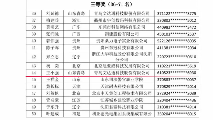 本次活動(dòng)中,青島安防協(xié)會(huì)副理事長(zhǎng)單位——青島文達(dá)通科技股份有限公司的劉延德、王小強(qiáng)分別在首屆全國(guó)安防行業(yè)職業(yè)技能競(jìng)賽總決賽中榮獲三等獎(jiǎng),與此同時(shí),青島文達(dá)通科技股份有限公司榮獲“競(jìng)賽優(yōu)勝單位”獎(jiǎng)。